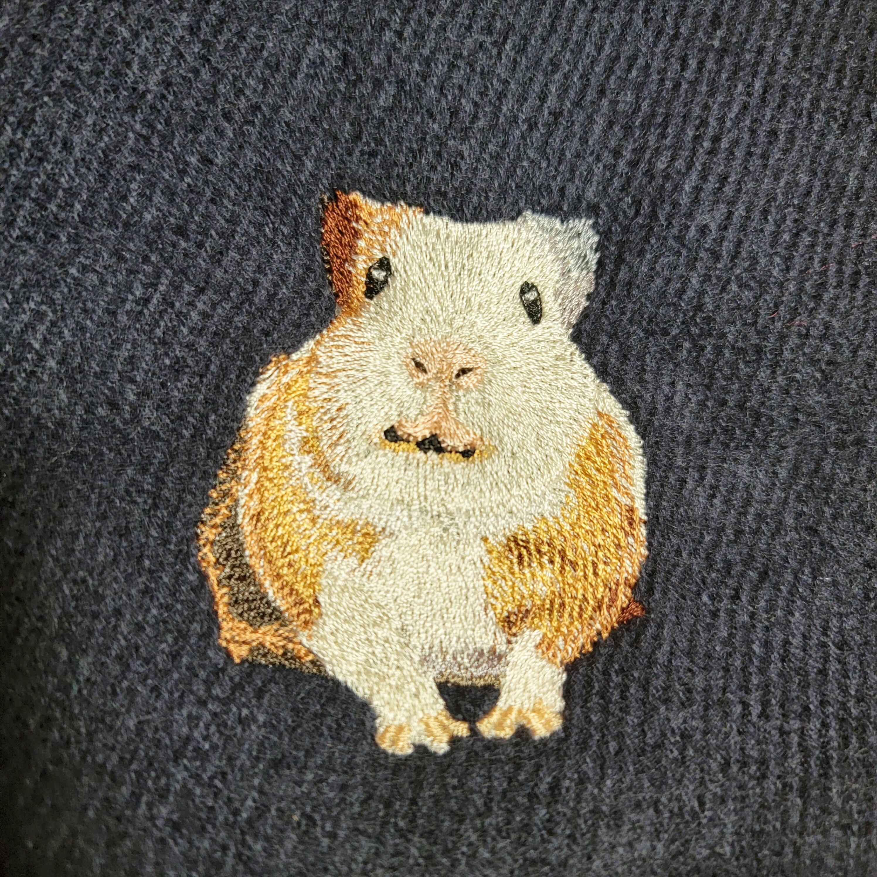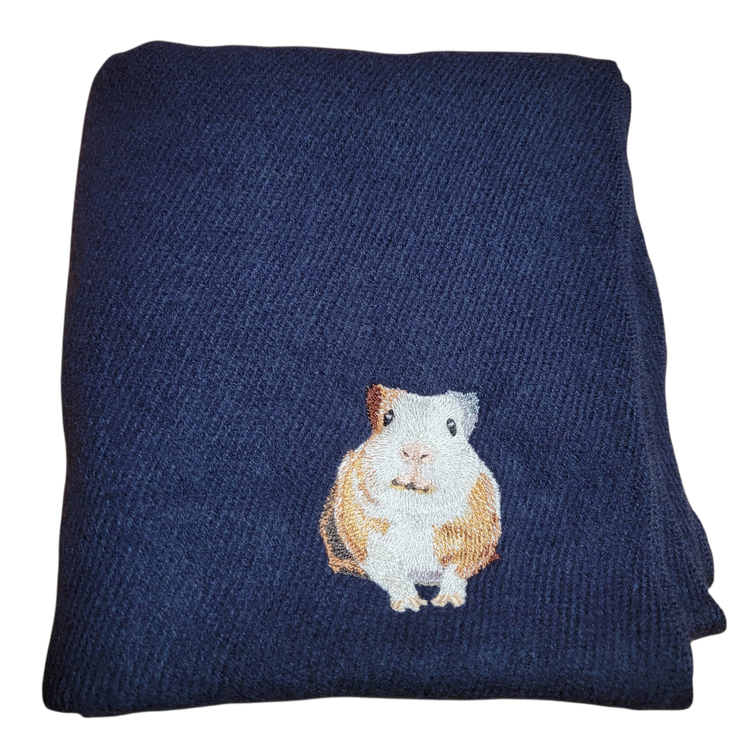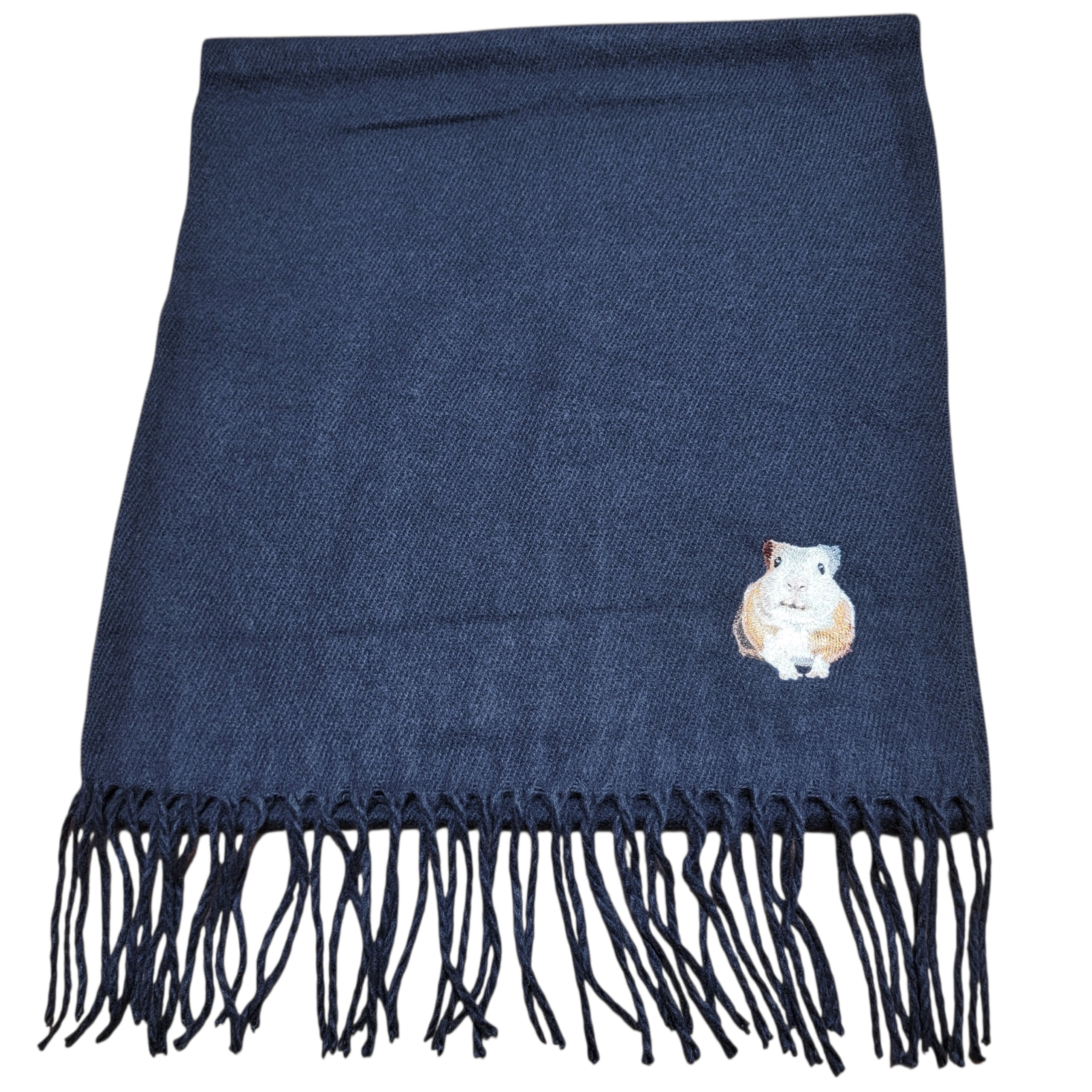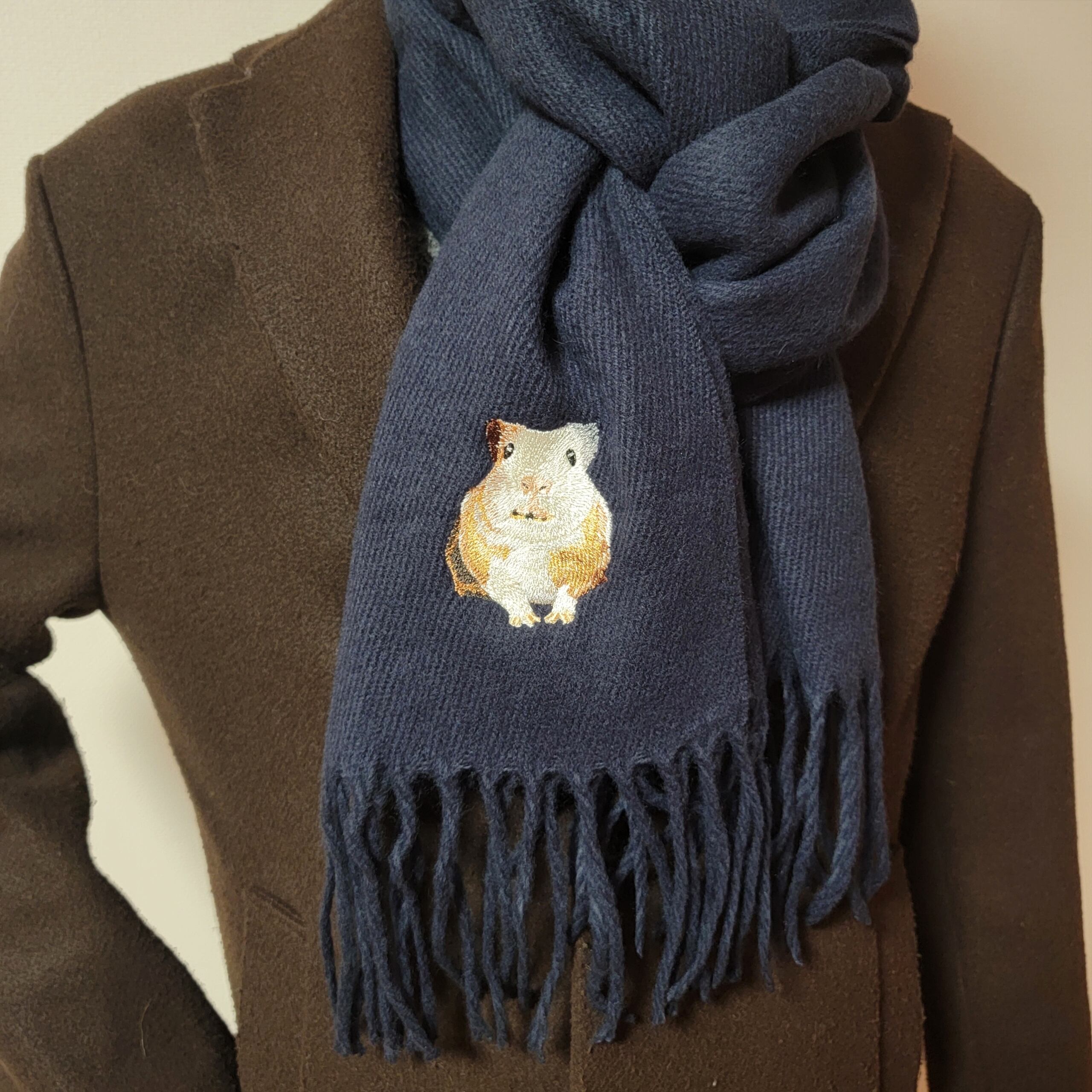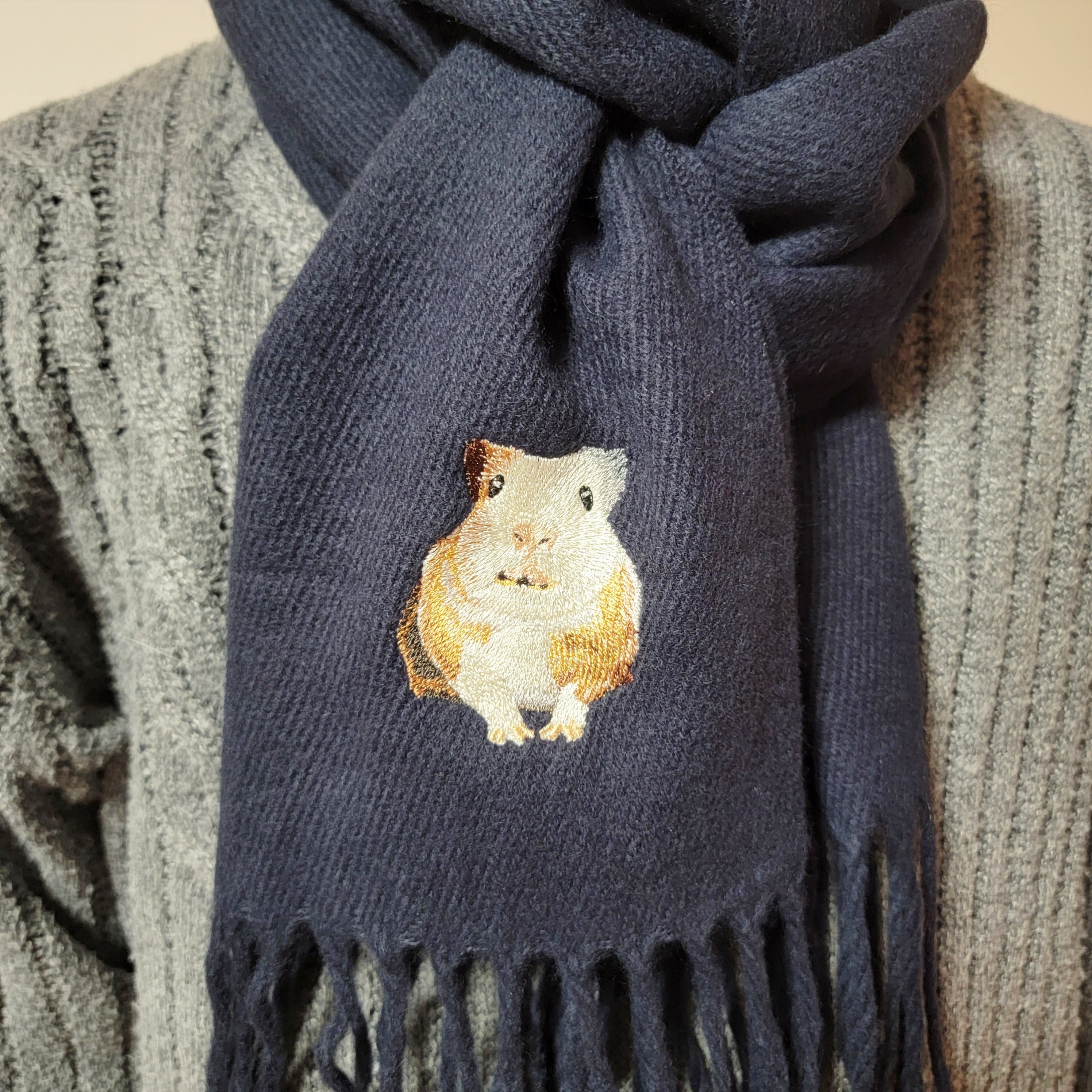 イングリッシュモルモットの「みたらし」が優しく刺繍された、あたたかさに包まれるロングマフラーです。