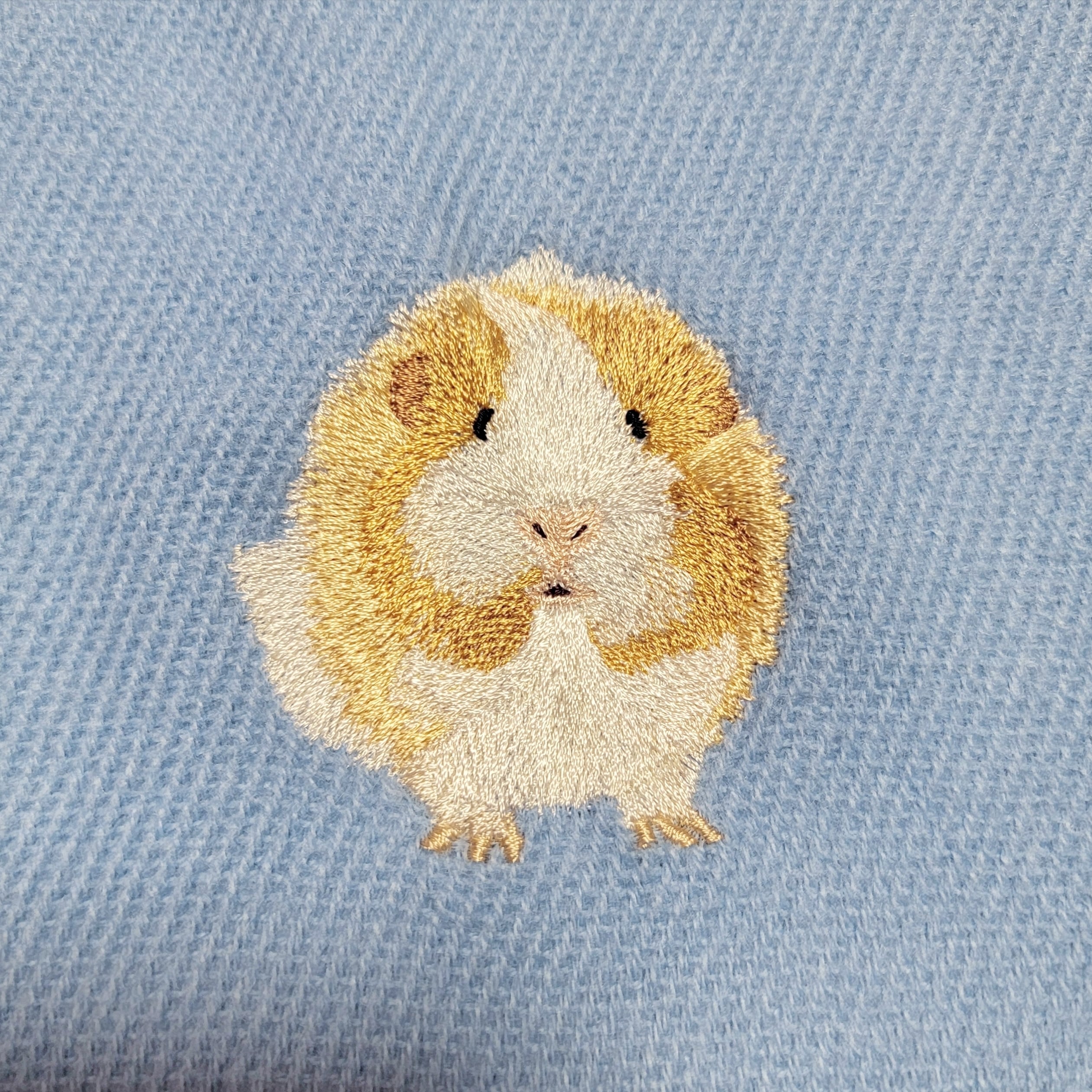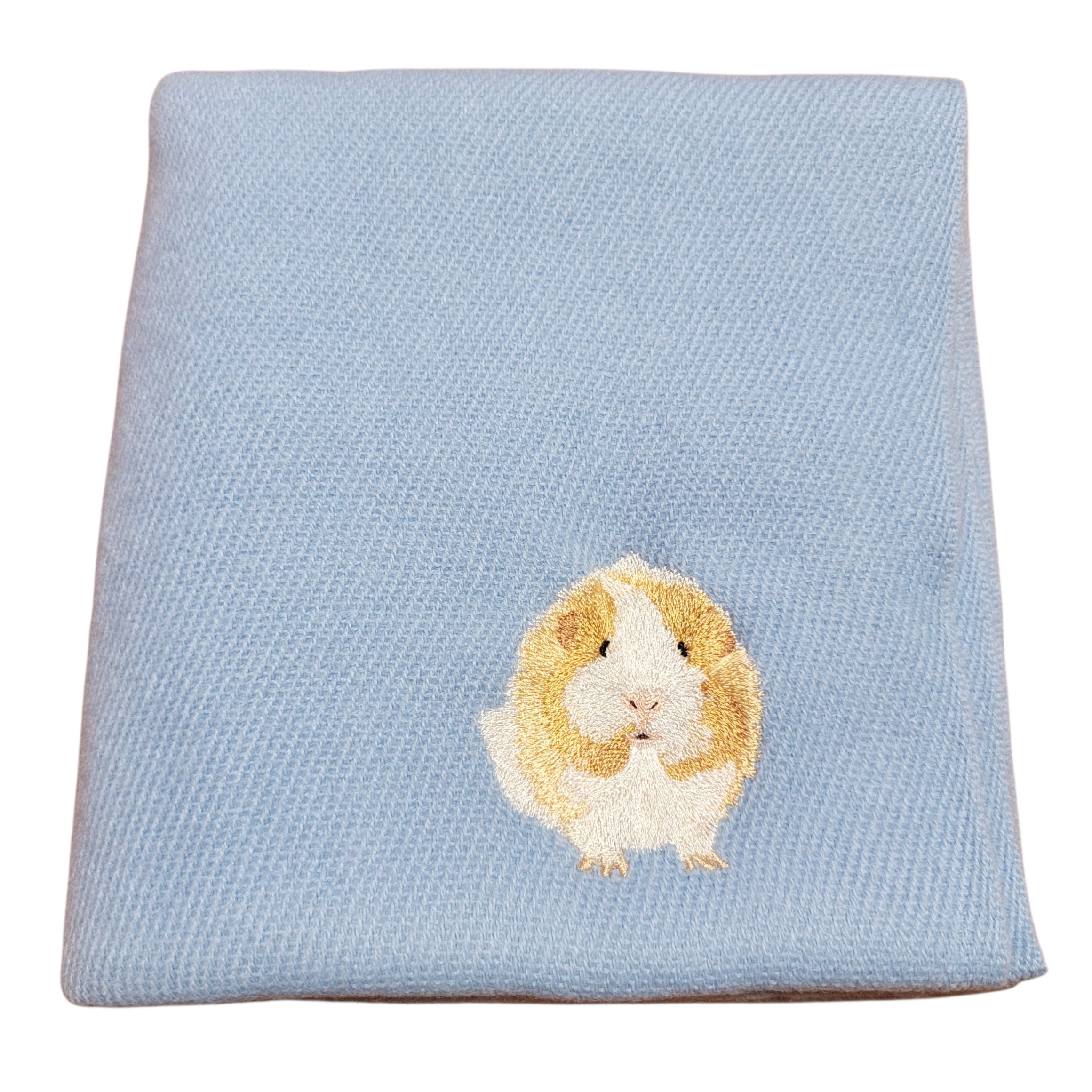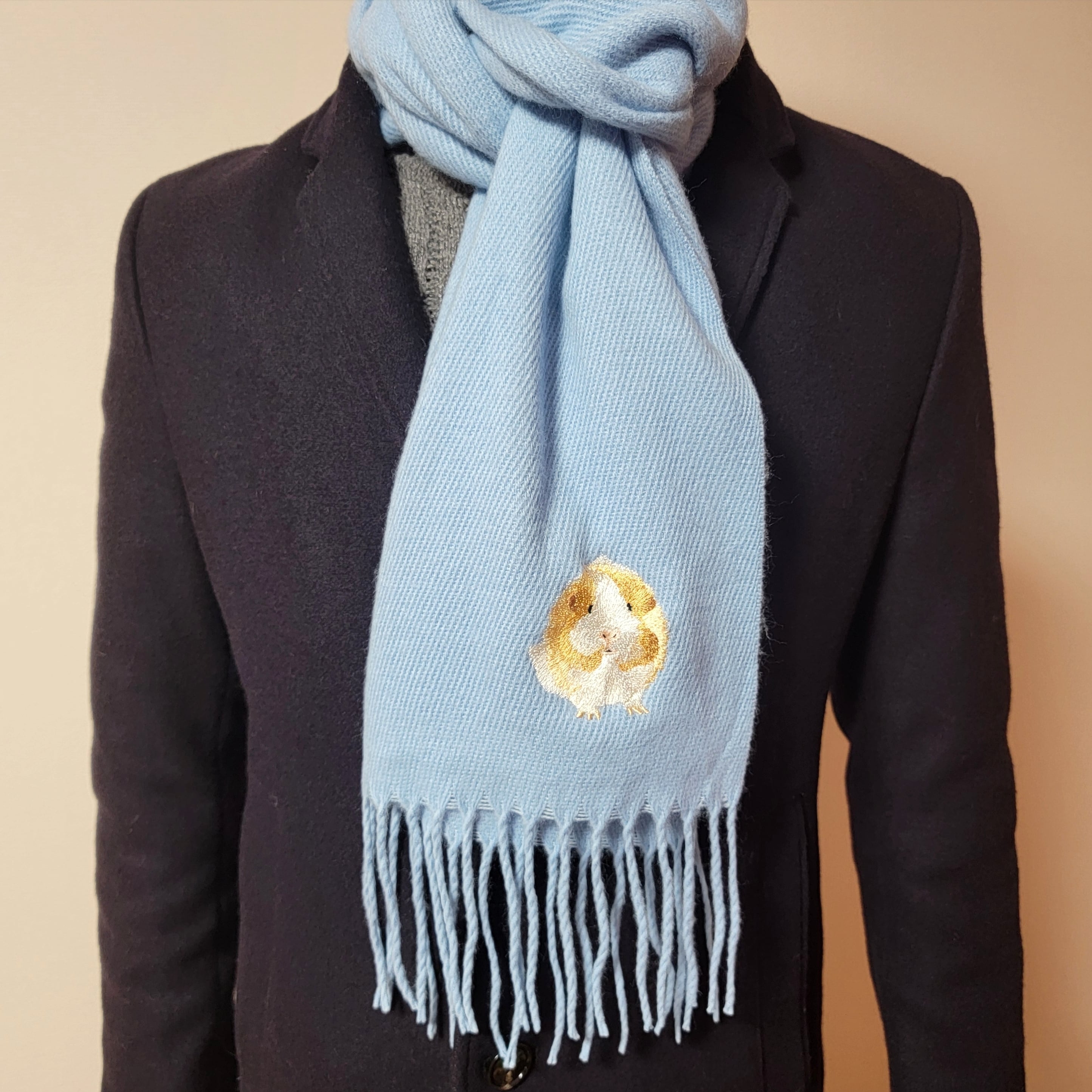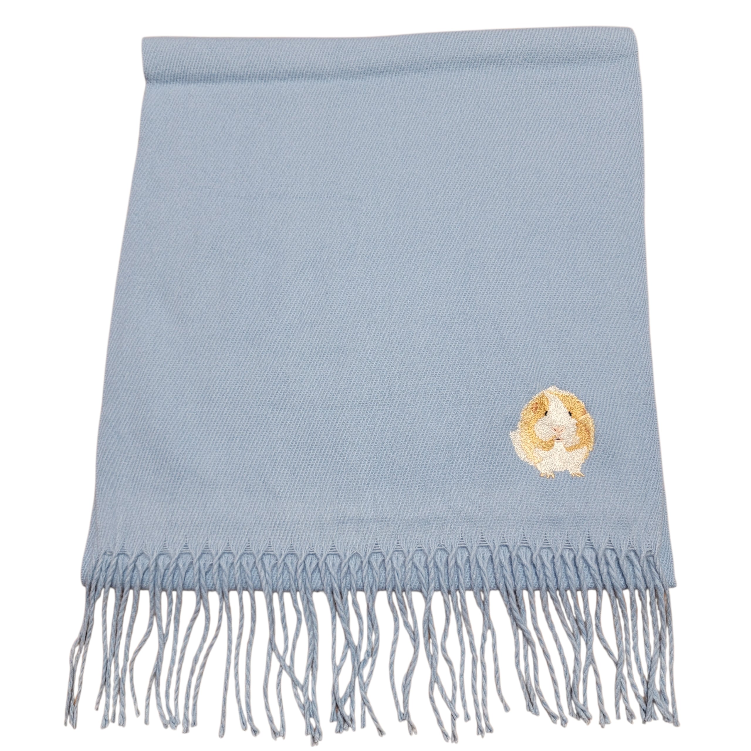 アビシニアンモルモットの「れーちぇ」が元気いっぱいに刺繍された、ふわふわのあったかロングマフラーです。