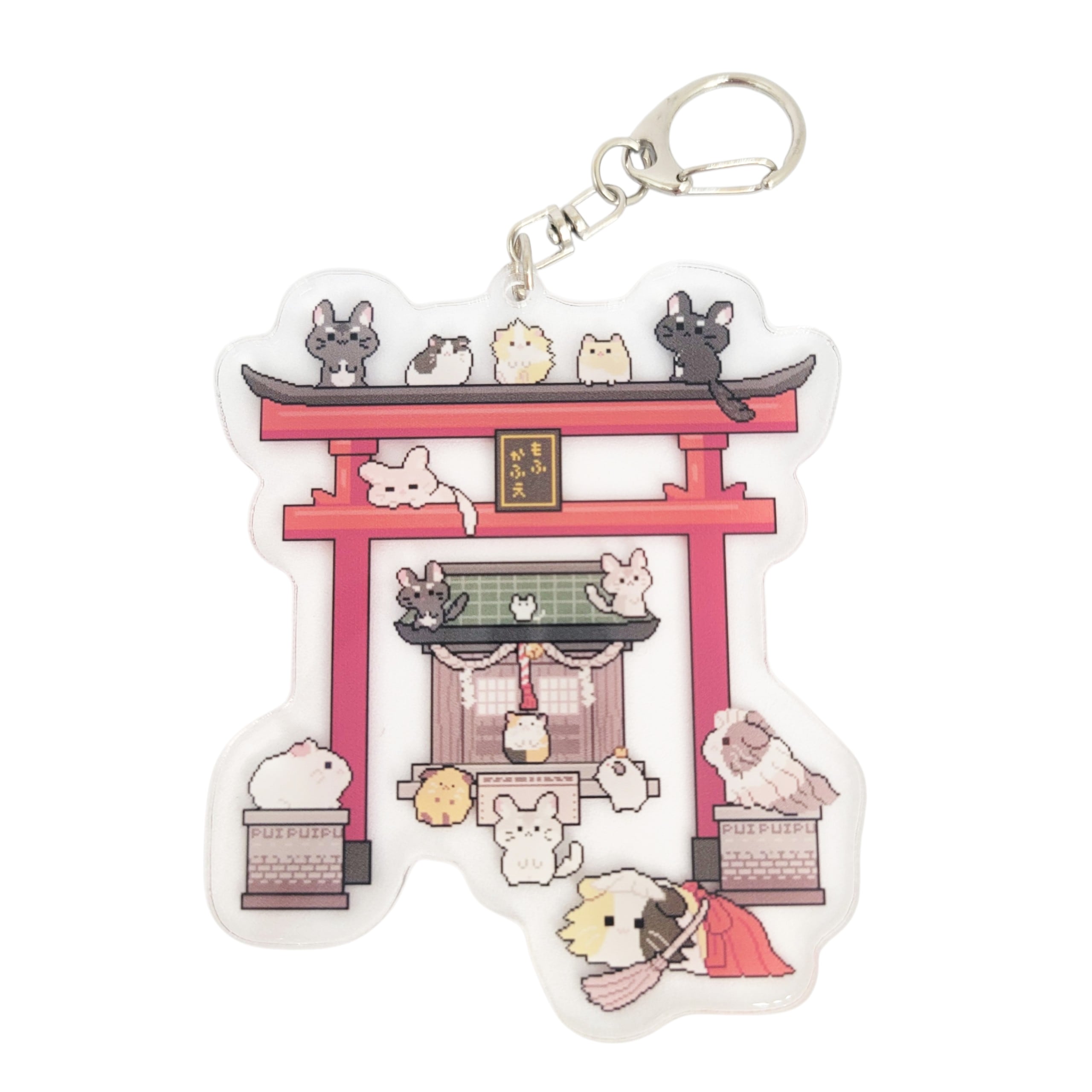 もふもふペットCafeのみんなが集まったドット絵を使ったアクリルキーホルダーです。 サイズ : 8.5cm × 7cm
